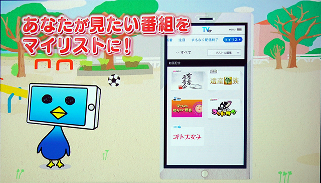 HOME > ニュース > AV&ホームシアターニュース 地上波に加えBSなどの番組やコーナー単位での配信も 民放キー局の人気番組を無料ネット配信する「Tver」が正式開始。各局アナがPR会見 編集部:小野佳希 2015年10月26日 前の写真へ 次の写真へ マイリストは配信期限などをプッシュ通知する機能なども装備 前の写真へ 次の写真へ この写真の記事へ 関連リンク 「TVer」公式サイト 民放5社、テレビ番組の無料見逃し配信サービス「TVer」を10月にスタート 【インタビュー】民放5社の見逃し配信「TVer」は “若者のテレビ離れ” を食い止められるか?