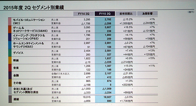 ソニー、2Qは増収増益。AV機器増益、スマホ損益改善も通期予想は据え置き