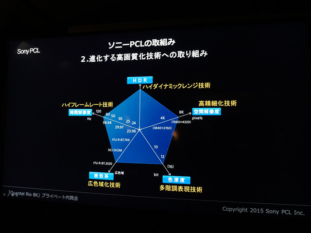 HOME > ニュース > AV&ホームシアターニュース 「Pablo Rio 8K」導入の208編集室内覧会を実施 ソニーPCL、8K対応編集室を披露。同社取り組み紹介や8K/4K HDRデモを実施 編集部:小野佳希 2015年11月25日 前の写真へ 次の写真へ それぞれ高度化する5つの軸に対応するべくシステム更新を行っている 前の写真へ 次の写真へ この写真の記事へ 関連リンク ソニーPCL 208編集室への「Pablo Rio 8K」導入に関するプレスリリース 岡三証券デジタルドームシアター「神楽洞夢」