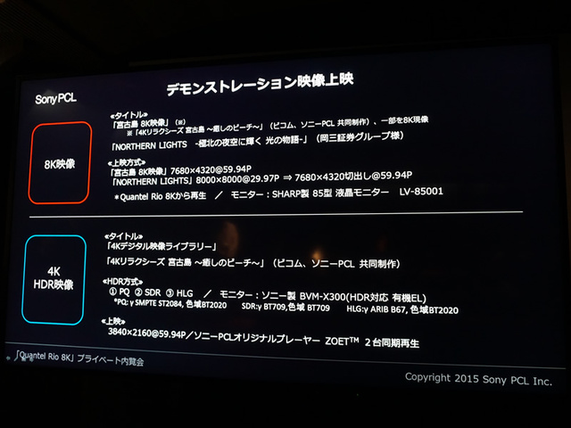 HOME > ニュース > AV&ホームシアターニュース 「Pablo Rio 8K」導入の208編集室内覧会を実施 ソニーPCL、8K対応編集室を披露。同社取り組み紹介や8K/4K HDRデモを実施 編集部:小野佳希 2015年11月25日 前の写真へ 次の写真へ デモコンテンツの詳細 前の写真へ 次の写真へ この写真の記事へ 関連リンク ソニーPCL 208編集室への「Pablo Rio 8K」導入に関するプレスリリース 岡三証券デジタルドームシアター「神楽洞夢」