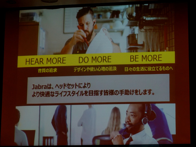 HOME > ニュース > AV&ホームシアターニュース 「ネックバンドタイプはアメリカでは主流」 Jabra、ネックバンド式とスポーツ向けのBluetoothイヤホン2機種。片耳タイプも 編集部:小野佳希 2015年12月02日 前の写真へ 音質を追求する「HEAR MORE」、デザインや使い心地を追求する「DO MORE」、日々の生活にもっと役立つことを目指す「BE MORE」という、製品開発における3つのキーワードも紹介 前の写真へ この写真の記事へ 関連リンク Jabra HALO FUSIONの詳細 Jabra SPORT PACE Wirelessの詳細 Jabra STEELの詳細 Jabra