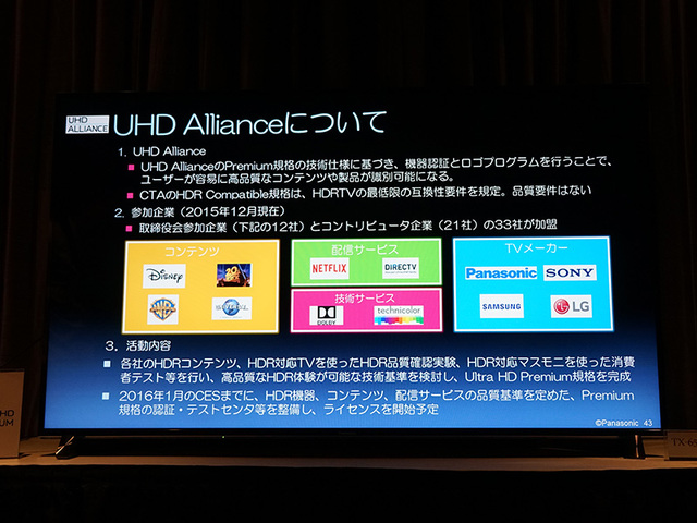 HOME > ニュース > AV&ホームシアターニュース パナソニック小塚氏、ソニー篠原氏に訊く <CES>4K/HDRテレビの認定基準“Ultra HD プレミアム”登場の背景とは?UHDAのキーマンに直撃! 折原 一也 2016年01月12日 前の写真へ 次の写真へ 「UHD Alliance」全体の概要 前の写真へ 次の写真へ この写真の記事へ 関連リンク 2016 International CES CES2016 レポート記事一覧