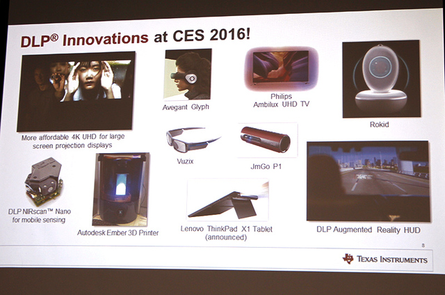 HOME > ニュース > AV&ホームシアターニュース 高速スイッチングで4Kを実現。小型で低コスト TI、0.67型4K DLPチップの技術説明会を開催。'16年春に出荷開始 編集部:小澤 麻実 2016年01月29日 前の写真へ DLPデバイスが様々な製品に活用できることもアピールされた 前の写真へ この写真の記事へ 関連リンク 4K DLPチップの詳細 テキサス・インスツルメンツ