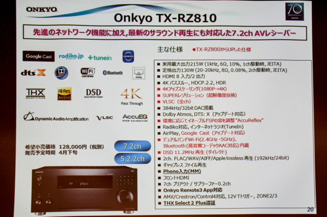 オンキヨー、アトモス/DTS:X対応の中級AVアンプ「TX-RZ810」。11.2MHz DSD再生対応