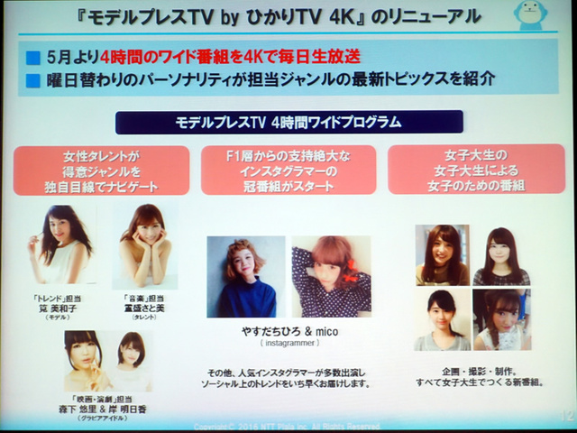 HOME > ニュース > AV&ホームシアターニュース 映画祭への協賛も発表。別所哲也さんも登壇 「今まで以上に4Kへ投資していく」 − ひかりTV社長が4K拡充戦略を語る 編集部:小野佳希 2016年04月14日 前の写真へ 次の写真へ 女性タレントや有名インスタグラマーなどを起用 前の写真へ 次の写真へ この写真の記事へ 関連リンク 「ショート・ショート フィルムフェスティバル & アジア 2016」協賛の詳細 「島ぜんぶでおーきな祭 第8回沖縄国際映画祭」協賛の詳細 ひかりTV 4K