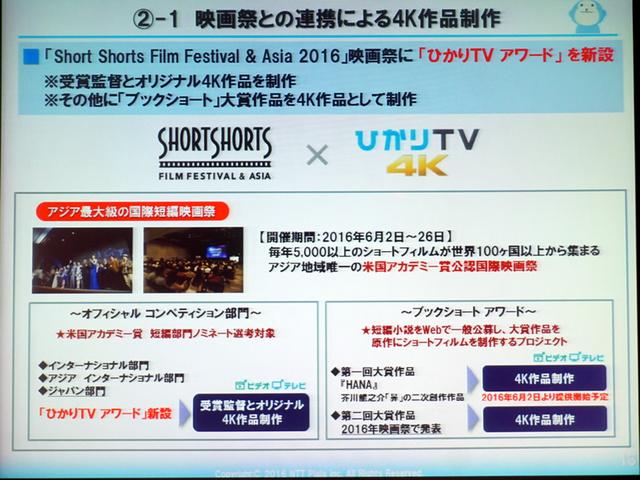 HOME > ニュース > AV&ホームシアターニュース 映画祭への協賛も発表。別所哲也さんも登壇 「今まで以上に4Kへ投資していく」 − ひかりTV社長が4K拡充戦略を語る 編集部:小野佳希 2016年04月14日 前の写真へ 次の写真へ 「ショート・ショート フィルムフェスティバル & アジア 2016」にアワードを新設 前の写真へ 次の写真へ この写真の記事へ 関連リンク 「ショート・ショート フィルムフェスティバル & アジア 2016」協賛の詳細 「島ぜんぶでおーきな祭 第8回沖縄国際映画祭」協賛の詳細 ひかりTV 4K