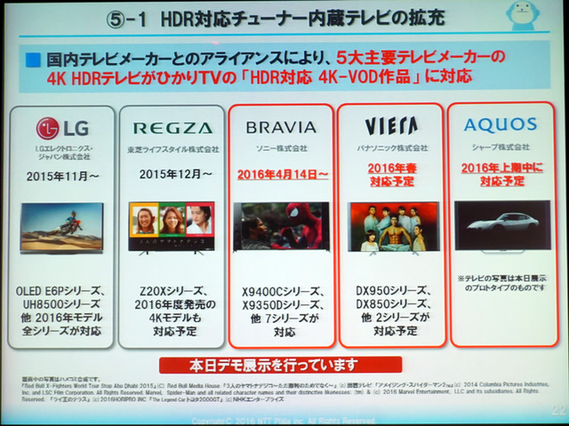HOME > ニュース > AV&ホームシアターニュース 映画祭への協賛も発表。別所哲也さんも登壇 「今まで以上に4Kへ投資していく」 − ひかりTV社長が4K拡充戦略を語る 編集部:小野佳希 2016年04月14日 前の写真へ 次の写真へ 各社のテレビがひかりTV 4K HDRに対応予定 前の写真へ 次の写真へ この写真の記事へ 関連リンク 「ショート・ショート フィルムフェスティバル & アジア 2016」協賛の詳細 「島ぜんぶでおーきな祭 第8回沖縄国際映画祭」協賛の詳細 ひかりTV 4K
