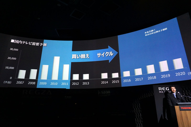 アナログ停波需要の反動で国内テレビ市場は落ち込んだがテレビ買い替えサイクルに入り今後は持ち直す見込みであると紹介