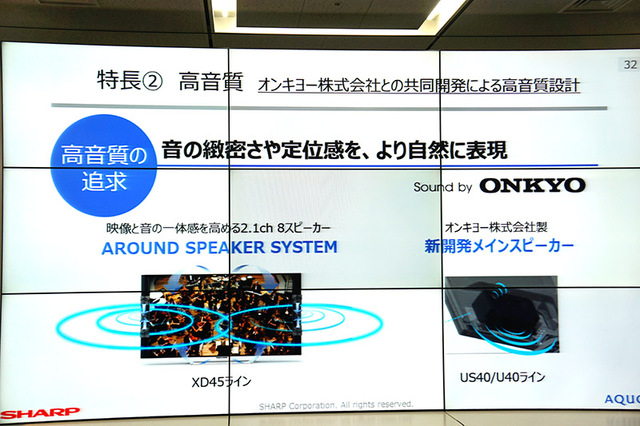HOME > ニュース > AV&ホームシアターニュース スピーカーはオンキヨーの技術を採用 シャープ、独自バックライト搭載モデルなどHDR対応4K AQUOS 7機種 編集部:風間雄介/小澤麻実 2016年04月21日 前の写真へ 「LC-55XD45」には総合出力65W・2.1ch 3ウェイ10スピーカーシステム「AROUND SPEAKER SYSTEM」を搭載 前の写真へ この写真の記事へ 関連リンク シャープ AQUOS 製品情報ページ