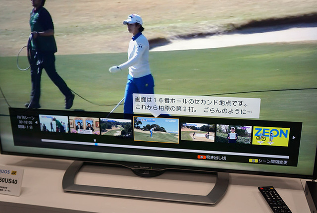 HOME > ニュース > AV&ホームシアターニュース '16年春のAQUOSと連携可能 シャープ、テレビ視聴を90分遡れる“AQUOSタイムシフト”搭載BDレコーダー8機種 編集部:杉浦 みな子 2016年04月21日 前の写真へ 次の写真へ 画面のように、字幕でシーンの概要を確認してから再生を開始することができる 前の写真へ 次の写真へ この写真の記事へ 関連リンク 製品のニュースリリース AQUOS製品情報ページ シャープ