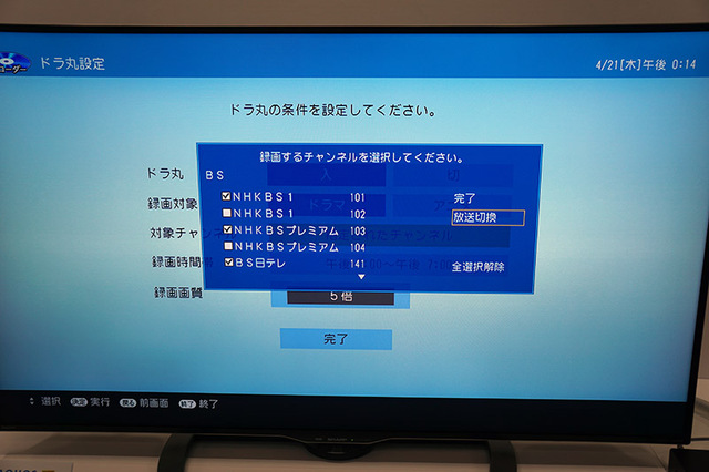 HOME > ニュース > AV&ホームシアターニュース '16年春のAQUOSと連携可能 シャープ、テレビ視聴を90分遡れる“AQUOSタイムシフト”搭載BDレコーダー8機種 編集部:杉浦 みな子 2016年04月21日 前の写真へ 次の写真へ ドラ丸では、新たにBSも対象に録画が可能になった 前の写真へ 次の写真へ この写真の記事へ 関連リンク 製品のニュースリリース AQUOS製品情報ページ シャープ
