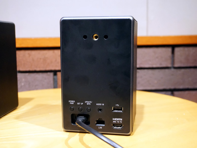 背面にHDMI端子やUSB端子、左右ペアリング用のボタンなどを装備
