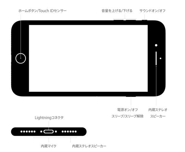 本体の各部と名称。3.5mmイヤホン端子が無くなったことがわかる