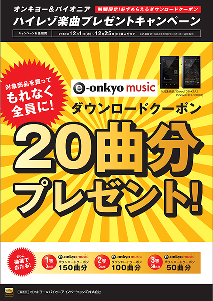 HOME > ニュース > AV&ホームシアターニュース 12月1日から開始 オンキヨー/パイオニアのDAP購入で、e-onkyoのハイレゾ音源が最大170曲当たるキャンペーン 編集部:伊藤 麻衣 2016年11月25日 前の写真へ 前の写真へ この写真の記事へ 関連リンク 本件のニュースリリース オンキヨー
