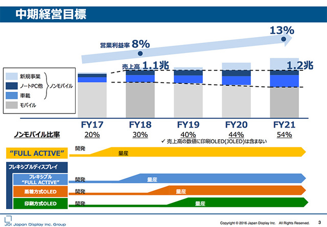 HOME > ニュース > AV&ホームシアターニュース 750億円の資金を調達 JDIがJOLEDを子会社化、2方式の有機ELを中期経営の柱に 編集部:風間雄介 2016年12月22日 前の写真へ 各ディスプレイの量産化の予定時期と売上げ/利益目標 前の写真へ この写真の記事へ 関連リンク ジャパンディスプレイ JOLED