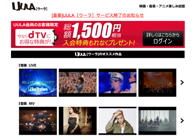 HOME > ニュース > AV&ホームシアターニュース dTVやゲオ チャンネル、AWAへの乗り換えを呼びかけ 定額制動画配信「UULA」、3月31日に全サービスを終了 編集部:伊藤 麻衣 2016年12月26日 公式サイトより この写真の記事へ 関連リンク 本件のニュースリリース UULA