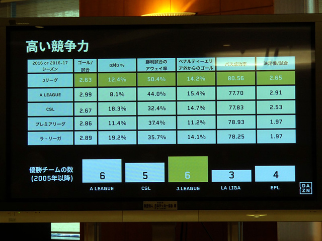 他国のサッカーリーグとくらべてもJリーグの各種数値は高いと紹介