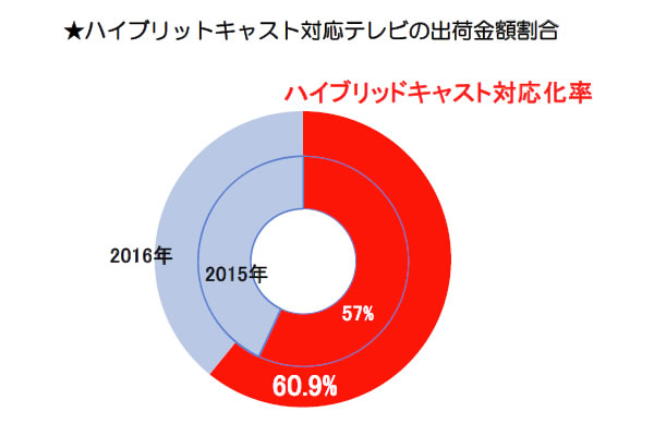HOME > ニュース > AV&ホームシアターニュース 全体は台数マイナスも金額で大幅プラス 2016年のテレビ出荷、4Kが牽引し金額ベースで2年ぶりプラス成長 編集部:小野佳希 2017年01月26日 前の写真へ ハイブリッドキャスト対応テレビの出荷金額割合 前の写真へ この写真の記事へ 関連リンク 本件の詳細(PDF) JEITA