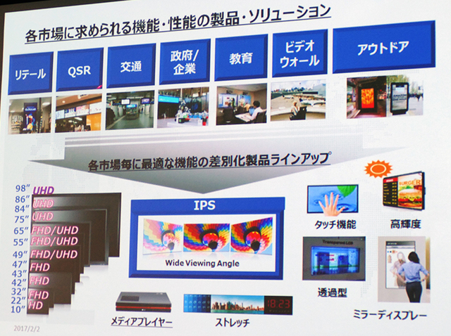 HOME > ニュース > AV&ホームシアターニュース 本日、製品発表会を開催 LG、有機ELデジタルサイネージ 3製品を日本市場に投入 ー 液晶にはない長所で新しい展示を訴求 編集部:川田菜月 2017年02月02日 前の写真へ 次の写真へ 製品ラインナップは市場に合わせて差別化を図っているとのこと 前の写真へ 次の写真へ この写真の記事へ 関連リンク デジタルサイネージ製品情報 LGエレクトロニクス