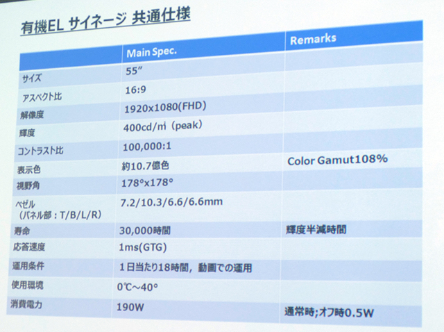 HOME > ニュース > AV&ホームシアターニュース 本日、製品発表会を開催 LG、有機ELデジタルサイネージ 3製品を日本市場に投入 ー 液晶にはない長所で新しい展示を訴求 編集部:川田菜月 2017年02月02日 前の写真へ 次の写真へ 今回の新製品の使用パネルは共通 前の写真へ 次の写真へ この写真の記事へ 関連リンク デジタルサイネージ製品情報 LGエレクトロニクス