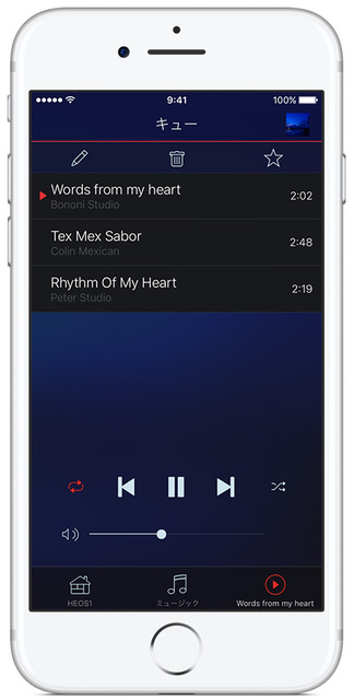 「再生中」画面では再生中の楽曲を確認できる。キュー再生にも対応。タブには再生中の楽曲名が表示されている