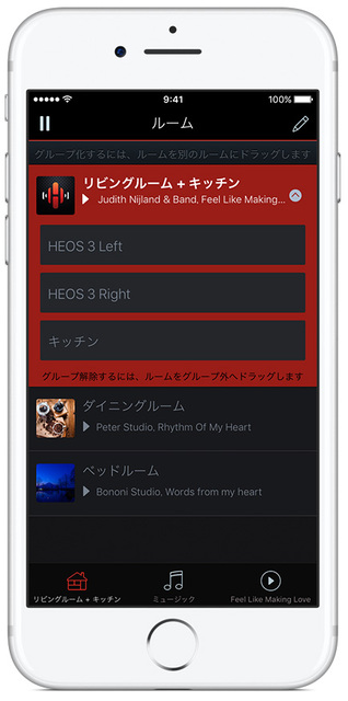 「ルーム」の画面では、複数のHEOSから操作・再生するものを選択したり、グルーピングしたりすることができる