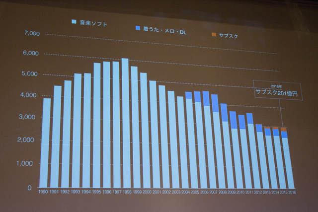 日本国内の音楽市場の動向。定額配信の割合は小さいが、急激に成長しているという