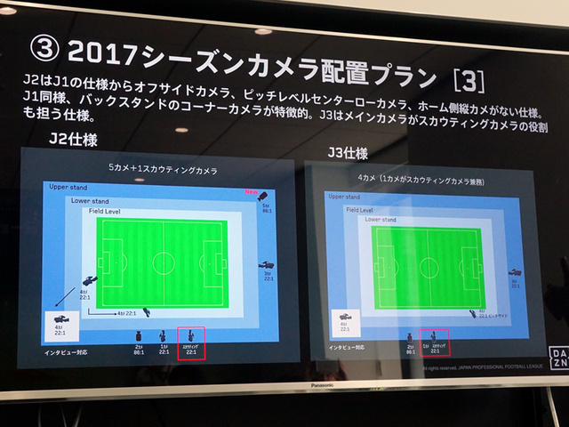 J2とJ3の試合でのカメラ配置。なおJ3は音声も実況のみで解説者なしという仕様だが、これはJリーグ側の判断だとのこと
