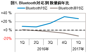 HOME > ニュース > AV&ホームシアターニュース 完全ワイヤレスタイプ製品の増加にも注目 Bluetoothヘッドホンの販売数、'17年1〜3月は前年27%の伸び 編集部:成藤正宣 2017年04月25日 Bluetoothヘッドホン販売数の前年比を示すグラフ この写真の記事へ 関連リンク GfKジャパンのプレスリリース
