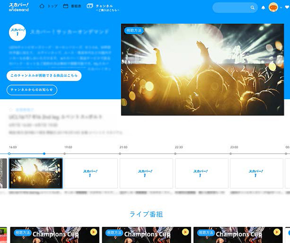 HOME > ニュース > AV&ホームシアターニュース 契約状況に合わせた番組表示など対応 スカパー!オンデマンド、ブラウザUI刷新。スペースシャワーTVのリアルタイム同時配信も 編集部:伊藤 麻衣 2017年04月27日 前の写真へ 次の写真へ 「チャンネルページ」画面 前の写真へ 次の写真へ この写真の記事へ 関連リンク 本件のニュースリリース スカパーJSAT(株)