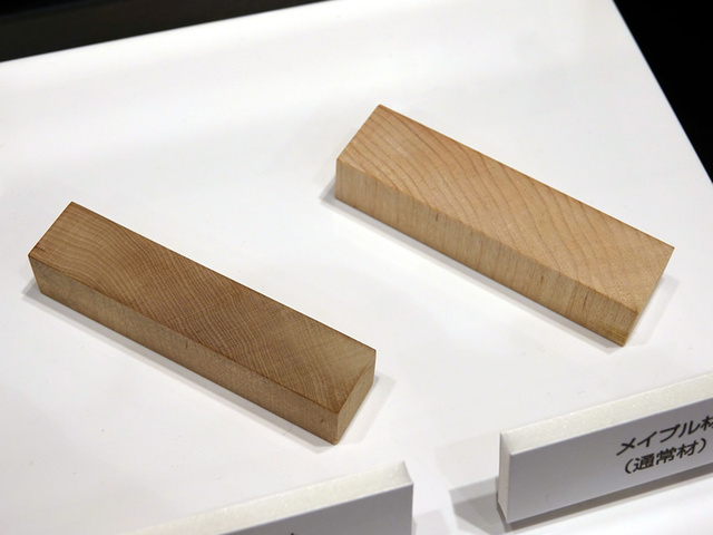 アクアティンバー(左)では通常のメイプル材(右)よりも木目が詰まっていることなどが分かる