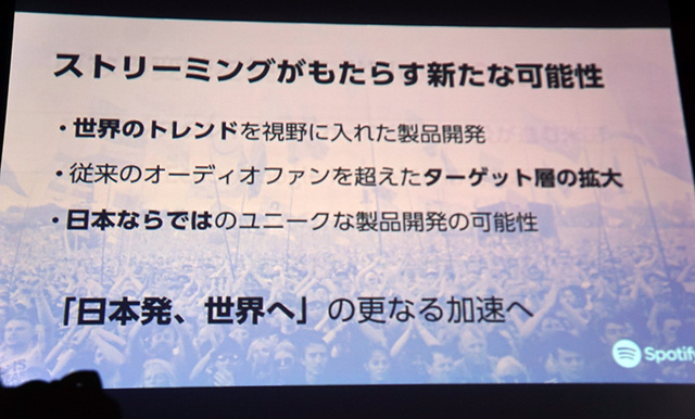 HOME > ニュース > AV&ホームシアターニュース 「日本発、世界へ」 <OTOTEN>Spotify玉木社長が基調講演。ストリーミングの可能性強調、日本発の製品に期待 編集部:風間雄介 2017年05月13日 前の写真へ ストリーミングを好機と捉えて製品開発を行うことで「日本発、世界へ」が加速するとエールを送った 前の写真へ この写真の記事へ 関連リンク Spotify OTOTEN 2017 PHILE WEB OTOTEN関連記事一覧