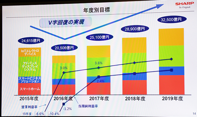 HOME > ニュース > AV&ホームシアターニュース 2019年度に売上高3兆2,500億円目指す シャープ、中期経営計画を発表。V字回復へ「8KとAIoT事業で世界を変える」 ファイルウェブ編集部 2017年05月26日 前の写真へ 次の写真へ 2017年度からV字回復を目指すとした 前の写真へ 次の写真へ この写真の記事へ 関連リンク 中期経営計画の詳細(PDF) シャープ
