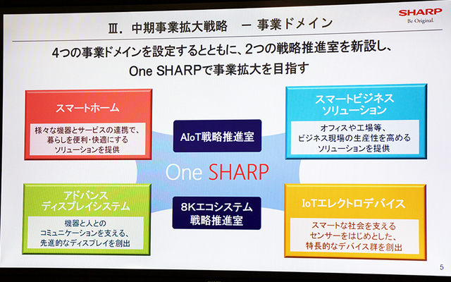 HOME > ニュース > AV&ホームシアターニュース 2019年度に売上高3兆2,500億円目指す シャープ、中期経営計画を発表。V字回復へ「8KとAIoT事業で世界を変える」 ファイルウェブ編集部 2017年05月26日 前の写真へ 次の写真へ 4つの事業ドメインを設定と2つの新事業推進室を設置する 前の写真へ 次の写真へ この写真の記事へ 関連リンク 中期経営計画の詳細(PDF) シャープ