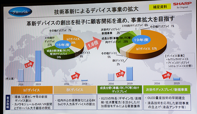 HOME > ニュース > AV&ホームシアターニュース 2019年度に売上高3兆2,500億円目指す シャープ、中期経営計画を発表。V字回復へ「8KとAIoT事業で世界を変える」 ファイルウェブ編集部 2017年05月26日 前の写真へ 次の写真へ 前の写真へ 次の写真へ この写真の記事へ 関連リンク 中期経営計画の詳細(PDF) シャープ