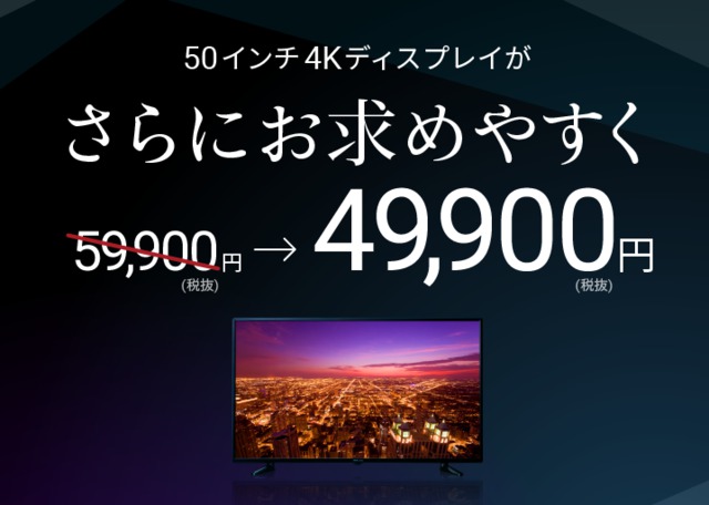 HOME > ニュース > AV&ホームシアターニュース 65インチモデルは価格改定なし DMM、50インチ4K液晶ディスプレイを1万円値下げ。49,900円に 編集部:押野 由宇 2017年06月14日 この写真の記事へ 関連リンク DMM.make DISPLAY DMM.make