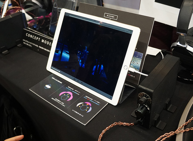 ヤマハの「“聴く”VR」デモ。iPadの音声を右側のアンプで処理して音場を拡張していた