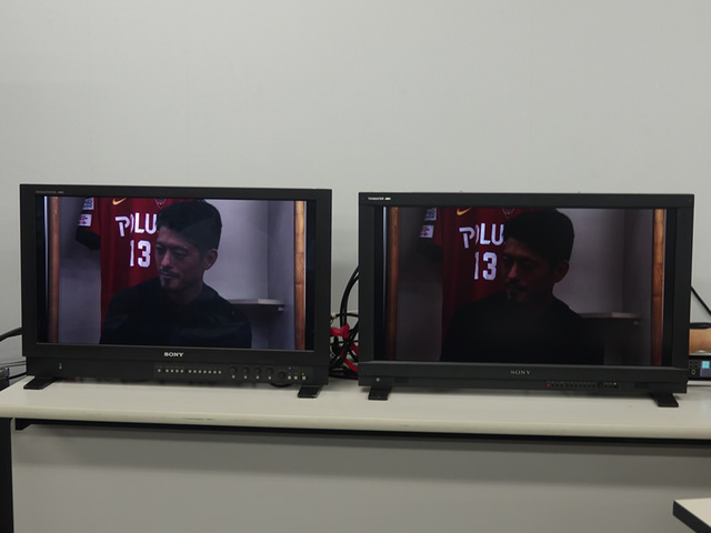 試合前のインタビュー映像。鈴木啓太氏の服や表情もHDRのほうがしっかり細部まで確認できる