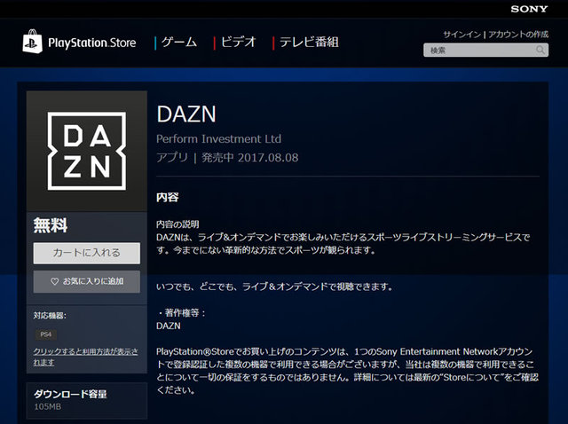 HOME > ニュース > AV&ホームシアターニュース 無料ダウンロード提供 DAZN、PS4向けアプリを提供開始 編集部:小野佳希 2017年08月08日 この写真の記事へ 関連リンク PlayStation Store DAZNアプリ提供ページ DAZN