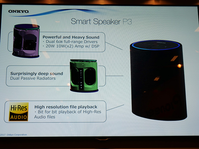 HOME > ニュース > AV&ホームシアターニュース スマートスピーカー2モデルを披露 <IFA>「ONKYO goes SMART」。Siri/Alexa/Google Assistant全方位対応のオンキヨーグループ 編集部:風間雄介 2017年09月01日 前の写真へ 同じくオーディオ品位にこだわった。ハイレゾ音源の再生も行える 前の写真へ この写真の記事へ 関連リンク オンキヨーグループ IFA日本語公式サイト IFAレポート記事一覧
