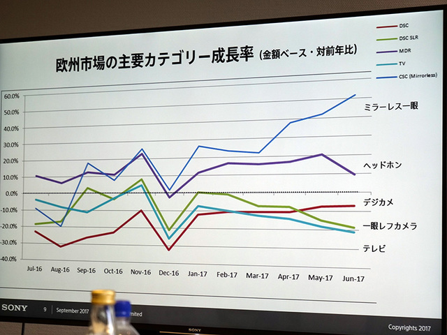 HOME > ニュース > AV&ホームシアターニュース 「ハイレゾ、諦めず続ける」 <IFA>高付加価値路線の追求でシェア好調 − ソニーヨーロッパ粂川社長に聞く 編集部:風間雄介 2017年09月02日 前の写真へ 次の写真へ 欧州市場の主要カテゴリーの成長率 前の写真へ 次の写真へ この写真の記事へ 関連リンク ソニー IFA日本語公式サイト IFAレポート記事一覧
