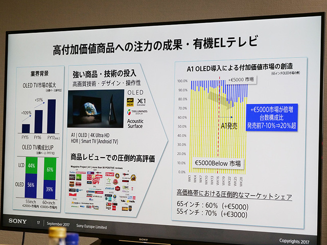 HOME > ニュース > AV&ホームシアターニュース 「ハイレゾ、諦めず続ける」 <IFA>高付加価値路線の追求でシェア好調 − ソニーヨーロッパ粂川社長に聞く 編集部:風間雄介 2017年09月02日 前の写真へ 次の写真へ BRAVIA A1で5000ユーロ市場が倍増したという 前の写真へ 次の写真へ この写真の記事へ 関連リンク ソニー IFA日本語公式サイト IFAレポート記事一覧