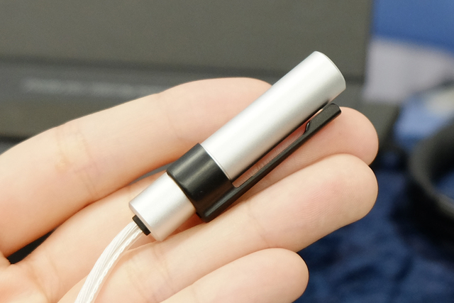 ケーブルの下部にマイク内蔵バッテリーパックを搭載。服に引っ掛けて使用できる