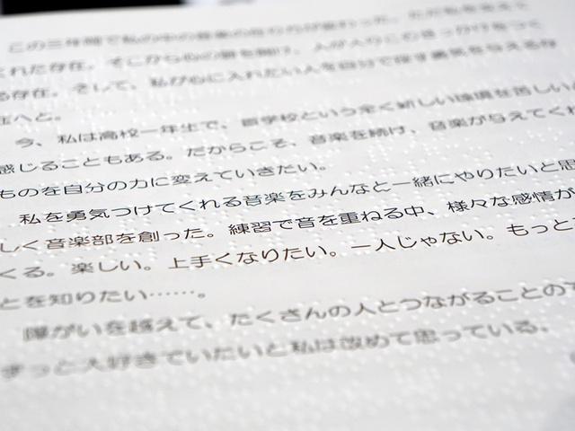 HOME > ニュース > AV&ホームシアターニュース 最優秀オーツキ賞に小林由紀さん「天使の杖とともに」 「オンキヨー世界点字作文コンクール」表彰式開催。受賞作に曲をつけての特別ライブも 編集部:小野佳希 2017年11月06日 前の写真へ 点字コンクール受賞作品集ももちろん点字で読むことができる 前の写真へ この写真の記事へ 関連リンク 第15回オンキヨー世界点字作文コンクール入選作品 オンキヨー 日本教育科学研究所 毎日新聞社「点字毎日」