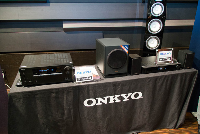 本日開催の記者発表会会場に展示された、各社のキャンペーン対象シアター製品。ONKYO「TX-NR676E」「BASE-V60B」、DENON「AVR-X1400H」「AVR-X4400H」