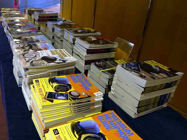 会場では「プレミアムヘッドホンガイド」韓国版のバックナンバーの姿が。韓国版は何と月刊!
