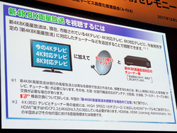 左旋の4K/8K放送ではアンテナ改修や新チューナーが必要と注意喚起。 A-PABが試験放送の開局説明会