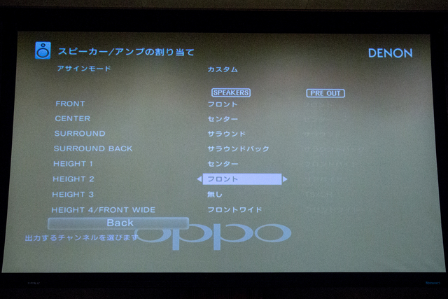 スピーカー/アンプの割り当てをカスタム設定していることろ。写真ではフロントとセンターをバイアンプに設定している