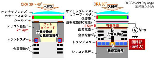 画素構成比較図。左がBSI(裏面反射)型シリコンセンサー、右が有機センサー