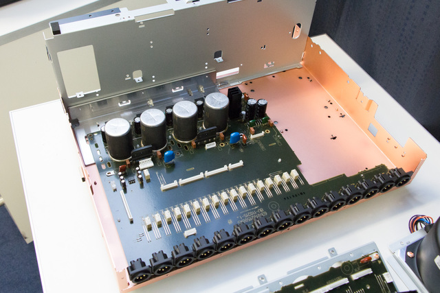 シャーシの中央付近に4基並んでいるのが、カスタムのブロックコンデンサーだ
